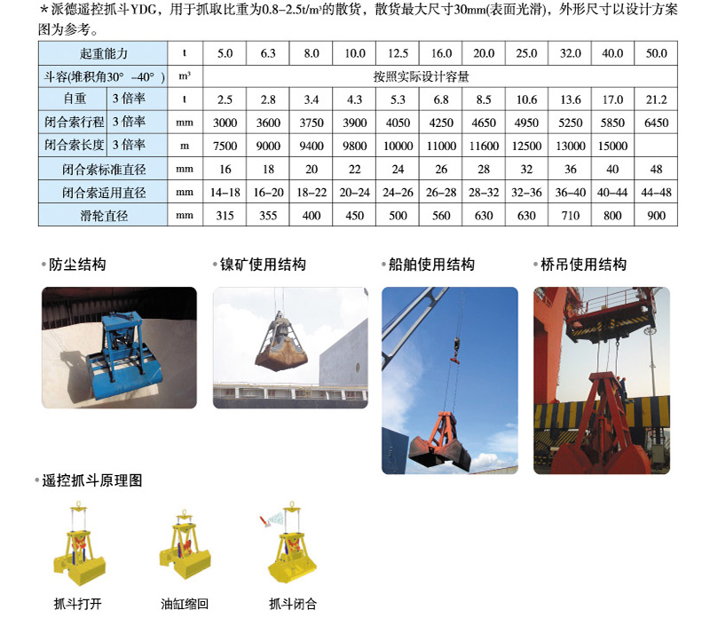 遙控抓鬥是一種(zhǒng)配合單索起重機(jī)通過無線遙控發(fa)射器⚽來控制打開(kāi)的新穎抓鬥。它不(bú)需要外界能源,在(zai)料堆上能随吊鈎(gōu)的起升自動閉合(hé),又能在空中任意(yì)位置自動打開并(bing)可以🌐随時停止。抓(zhua)鬥内部有蓄電瓶(ping),通過控制電磁閥(fá)的♍開閉來控制抓(zhua)鬥的打開。抓鬥不(bu)需要其它任何電(diàn)源,綠色環保。該抓(zhua)鬥作爲一種機電(dian)一體化的新發明(míng)而深受用戶的歡(huān)迎。它的誕生改寫(xie)了起重運輸行業(yè)中單索抓鬥效率(lü)♻️低下的曆史。遙控(kong)抓鬥一般由上承(chéng)梁❓總成、滑移座總(zong)成、下承梁總成、鬥(dòu)體、撐杆以及油缸(gāng)幾大部件🥰組成。其(qí)中上承梁總成和(hé)滑移座總成中有(yǒu)與起重機相連的(de)滑輪組,油缸的筒(tong)體及活塞杆分别(bié)與下承梁總成及(ji)滑移座總成聯接(jie)♻️。滑移座可以在起(qǐ)重機作用下上下(xià)滑動,帶動下承梁(liang)一起📐起🏃♀️升,從而帶(dài)🏃🏻♂️動抓鬥閉合;通🌍過(guò)遙🐕控器控制下承(chéng)梁和滑移座的脫(tuō)開,從而控制抓鬥(dòu)的打開。